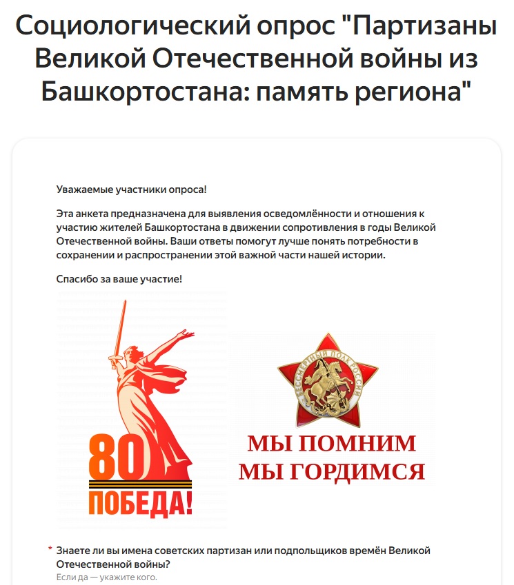 01 июня 2025 — 30 июня 2025Онлайн-опрос: отношение жителей Башкортостана к сохранению памяти о партизанах Великой Отечественной войны