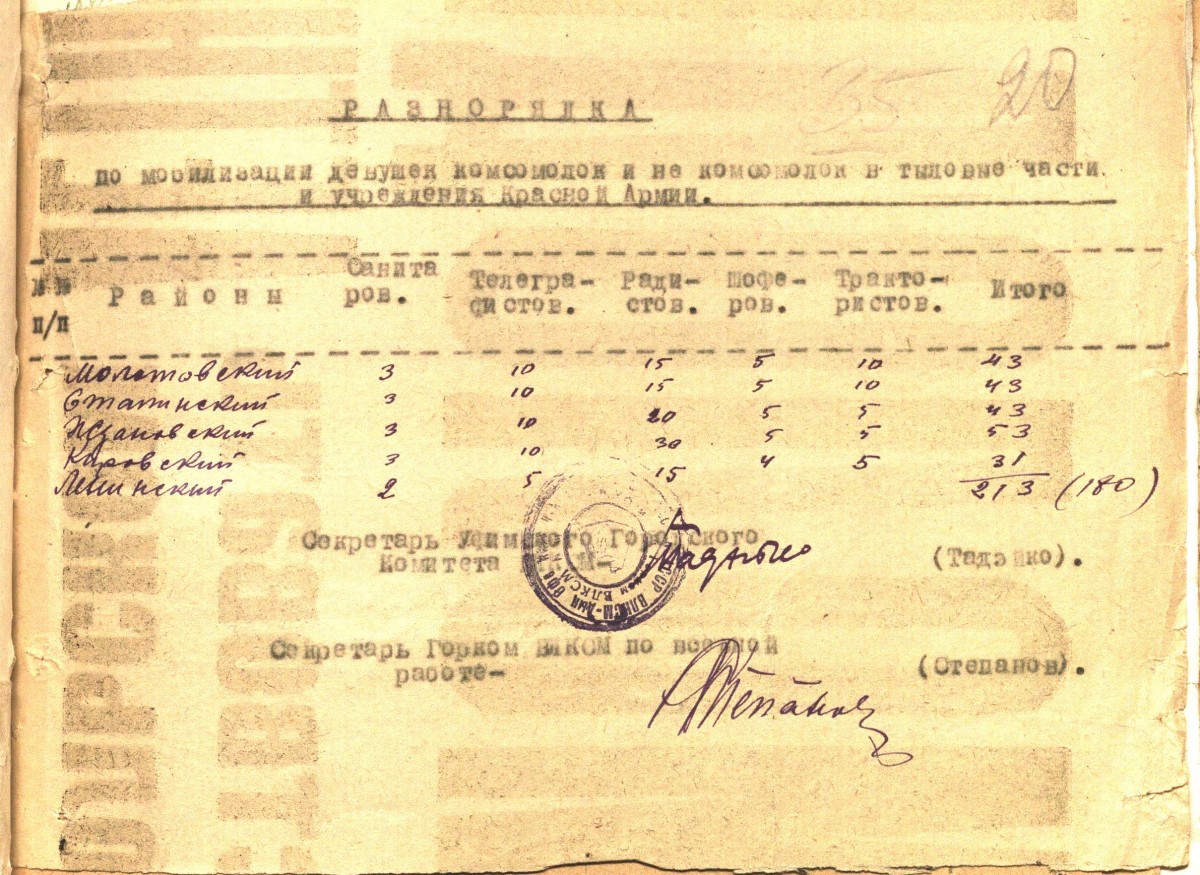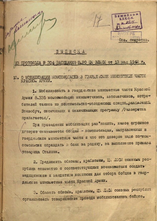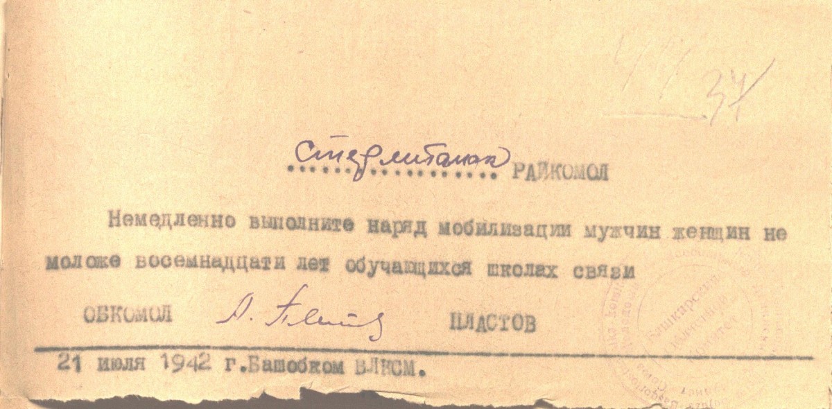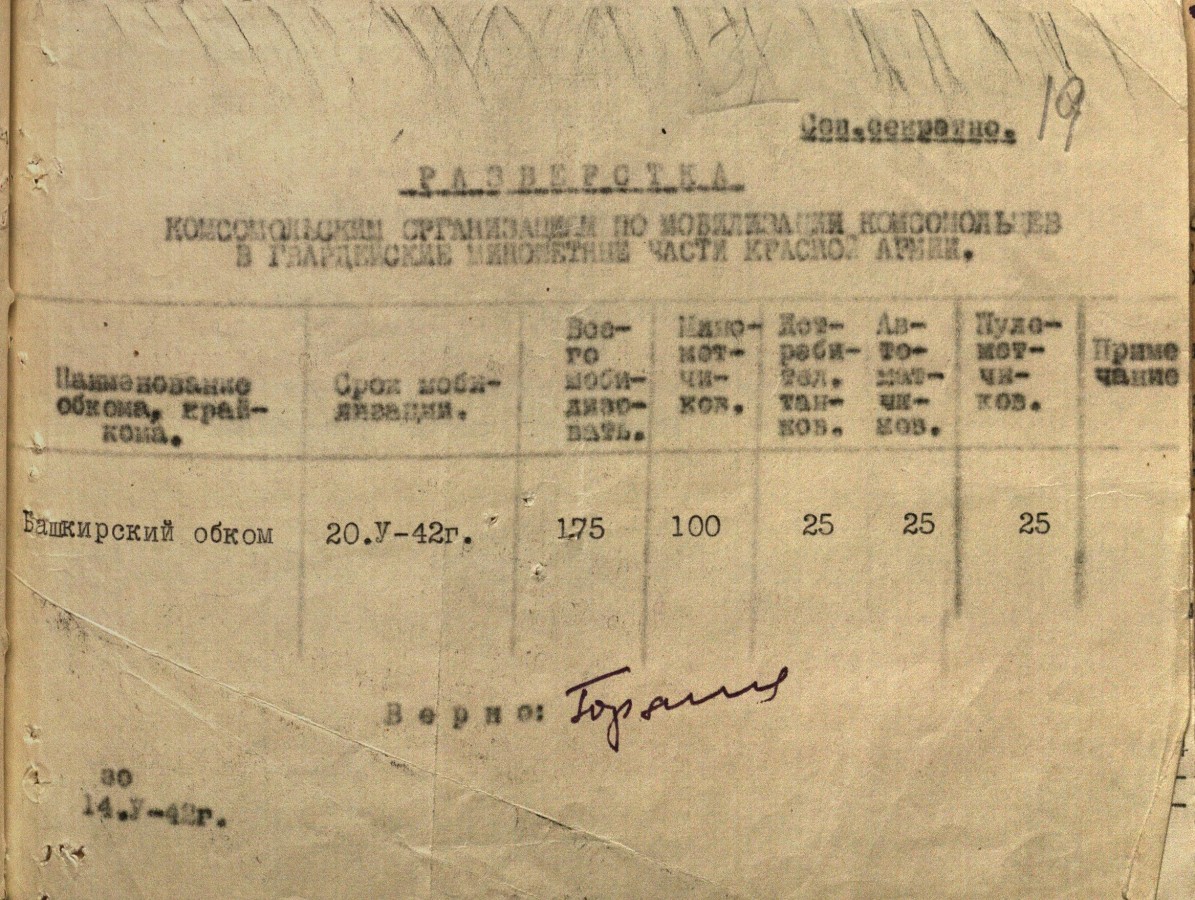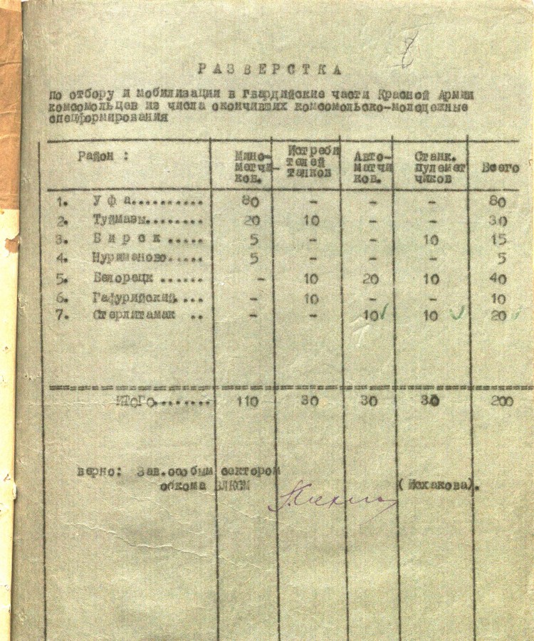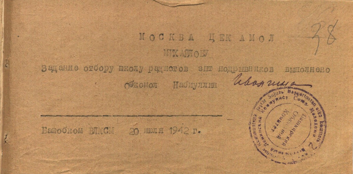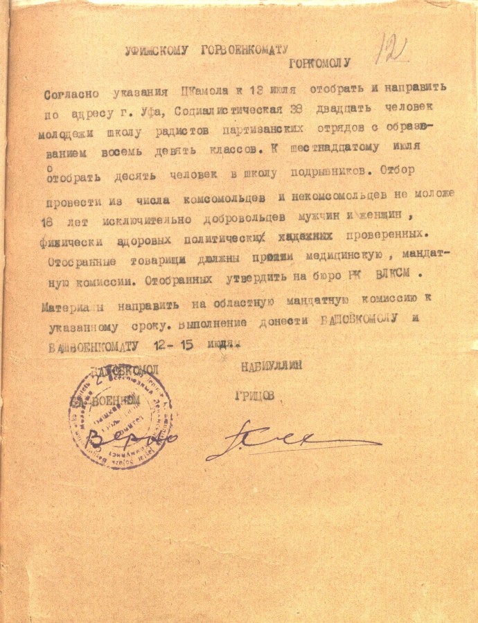 «К 16 июля отобрать 10 человек в школу подрывников. Отбор произвести из числа комсомольцев не моложе 18 лет исключительно добровольцев из мужчин и женщин, физически здоровых политически проверенных. Отобранные товарищи должны пройти медицинскую, мандатную комиссии. Отобранных утвердить на бюро РК ВЛКСМ. Материалы направить на областную мандатную комиссию к указанному сроку. Выполнение донести БАШОБКОМОЛУ и БАШВОЕНКОМАТУ 12-15 июля».