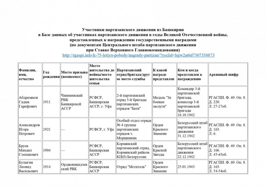 Участники историко-культурного проекта «Жители Башкирии в рядах партизан и подпольщиков в годы Великой Отечественной войны 1941—1945 гг.», реализуемого в рамках гранта Главы Республики Башкортостан, изучили информацию в Базе данных «Подвиг партизан», созданной Российским государственным архивом социально-политической истории (РГАСПИ) по документам фонда Центрального штаба партизанского движения при Ставке Верховного Главнокомандования об участниках партизанского движения, представленных к награждению государственными наградами http://rgaspi.info/k-75-letiyu-pobedy/nagrady-partizan/.