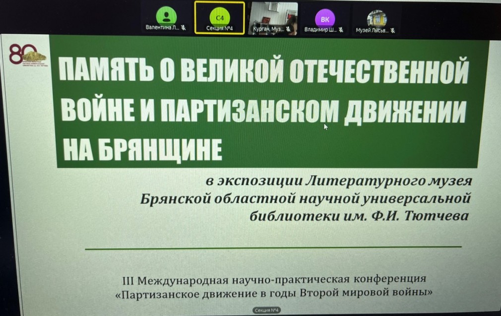 Ученые, представители музейного, архивного и библиотечного сообщества, государственных и общественных организаций из Белгорода, Краснодара, Кургана, Курска, Москвы, Саратова, Твери, Брянска и Брянской области, а также Мурманской и Псковской областей, республик Башкортостан и Марий Эл, Краснодарского и Пермского края, представители Белоруссии из Бреста и Минска поделились опытом работы по увековечиванию памяти о героях-партизанах, сохранению исторической памяти, сбережению исторического опыта формирования традиционных духовно-нравственных ценностей и их влияния на патриотическое воспитание и просвещение современного поколения.