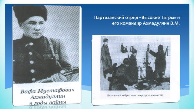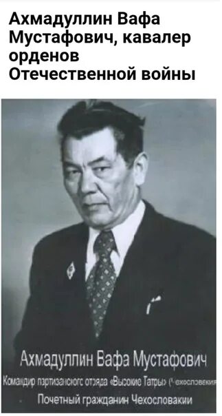 Вот об этом отряде, воевавшем с фашистами в Татрах, и о его командире, нашем земляке Вафе Мустафиче Ахмадуллине (в некоторых документах он назван Василием) и пойдет речь в нашем рассказе: