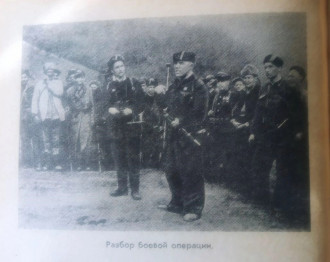 Фотография из книги М.Македонского “Пламя над Крымом” где запечатлены Командир Южного соединения М.А.Македонский и командир 6- й бригады М. Ф. Самойленко с бойцами во время разбора военной операции. Галин. Х.А. третий справа ( в шапке - ушанке).