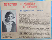В июле 1981 г. из г. Алма-Ата Казахстана от старшей сестры Натальи Алексеевны Соколовой Марии Васильевны Буниной в среднюю школу №1 г. Белебея поступило письмо с материалами о Наталье Алексеевне: