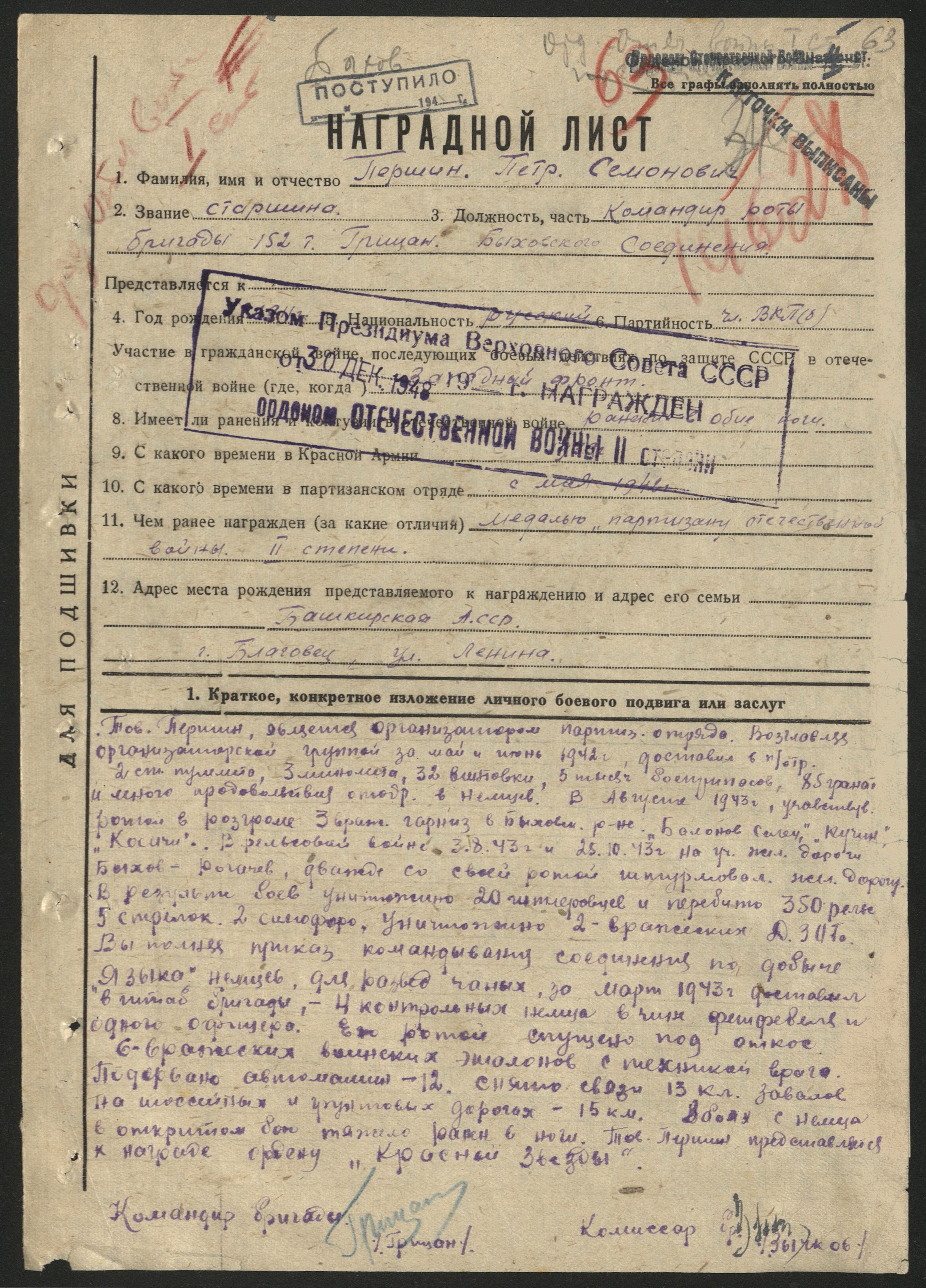 - К ордену Красной Звезды: «Организатор партизанского отряда. За май–июнь 1942 г. доставил 2 ст. пулемёта, 3 миномёта, 32 винтовки, 5 тыс. патронов, 85 гранат. В августе 1943 г. с ротой разгромил 3 гарнизона в Быховском районе. В «рельсовой войне» дважды штурмовал ж/д Быхов–Рогачёв: уничтожено 20 гитлеровцев, перебито 350 рельсов, 5 стрелок, 2 семафора, 2 ДЗОТа. Доставил 5 «языков»-немцев. Ротой спущено 6 эшелонов, подорвано 12 автомашин, снято 13 км связи, завалено 15 км дорог. Тяжело ранен в ноги».