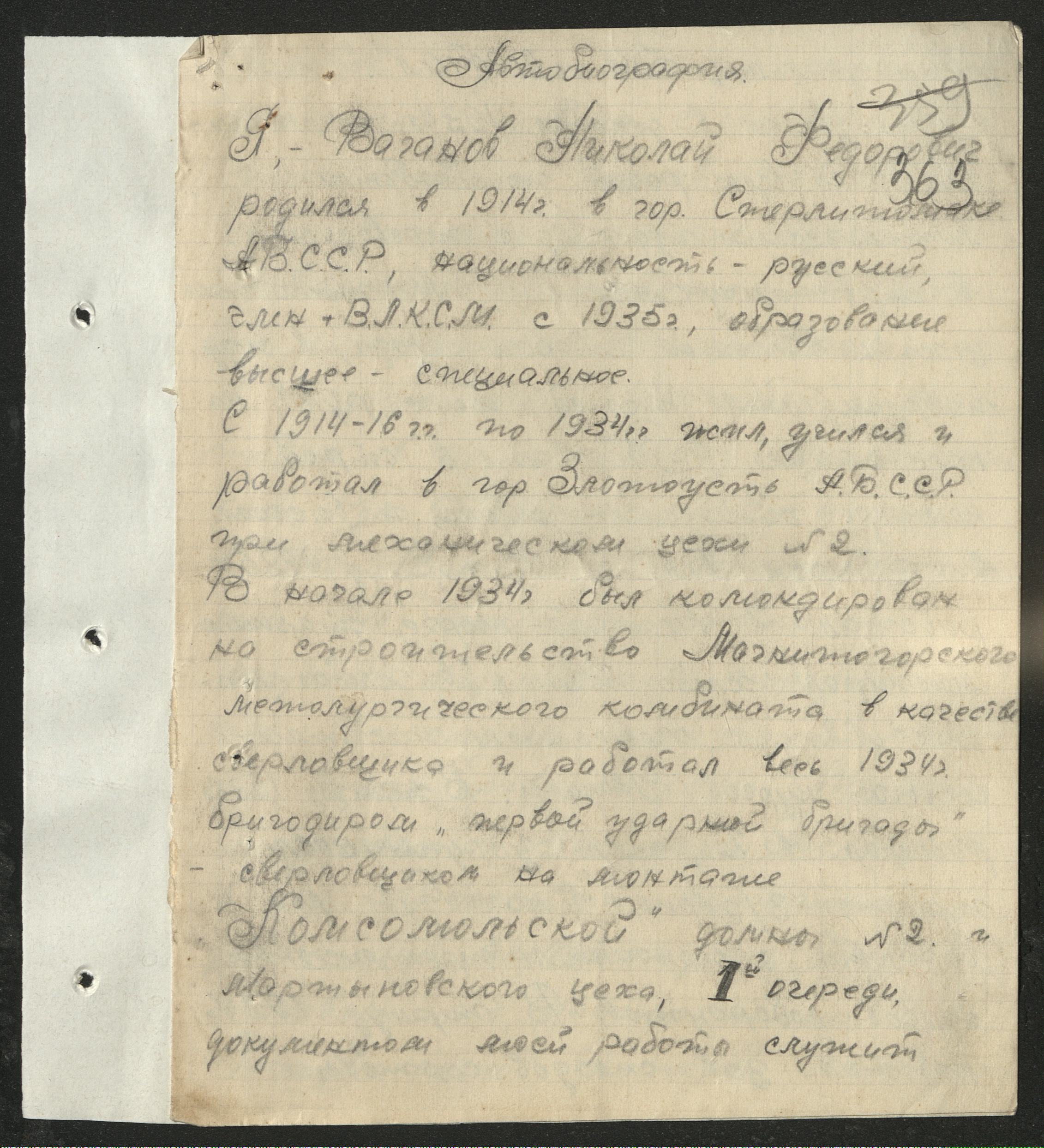 В автобиографии Ваганов Н.Ф. рассказывает о себе: «Я, Ваганов Николай Федорович, родился в 1914 г. в гор. Стерлитамаке АБССР, национальность – русский, член ВЛКСМ с 1935 г., образование высшее – специальное.