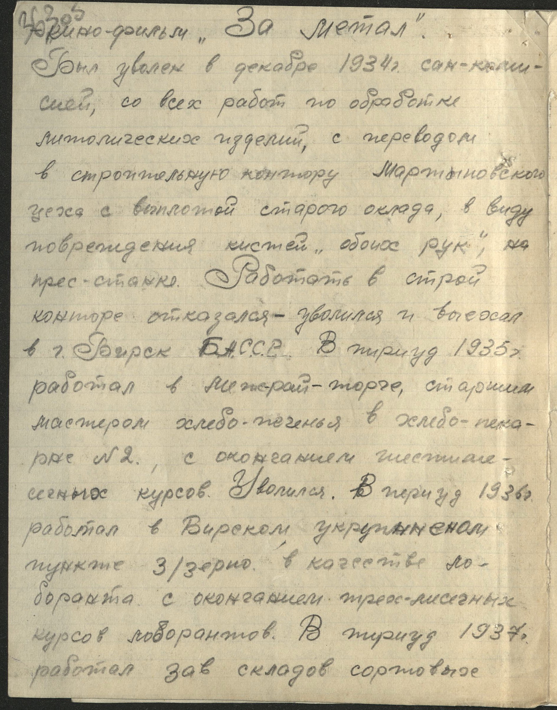 Был уволен в декабре 1934 г. сан-комиссией со всех работ по обработке металлических изделий с переводом в строительную контору Мартыновского цеха с выплатой старого оклада ввиду повреждения кистей «обоих рук» на пресс-станке. Работать в стройконторе отказался – уволился и выехал в г.Бирск БАССР.