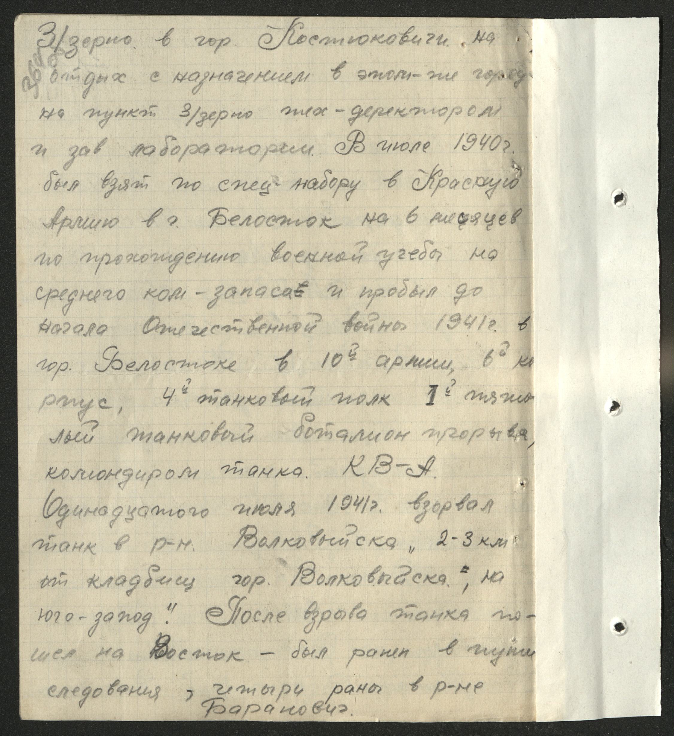 Одиннадцатого июля 1941 г. взорвал танк в р-не Волковыйска «2-3 км» от кладбищ г. Волковыйска на юго-запад. После взрыва танка пошел на Восток – был ранен в пути следования, четыре раны, в р-не Баранович. Подобран и отправлен в госпиталь гор. Бреста.