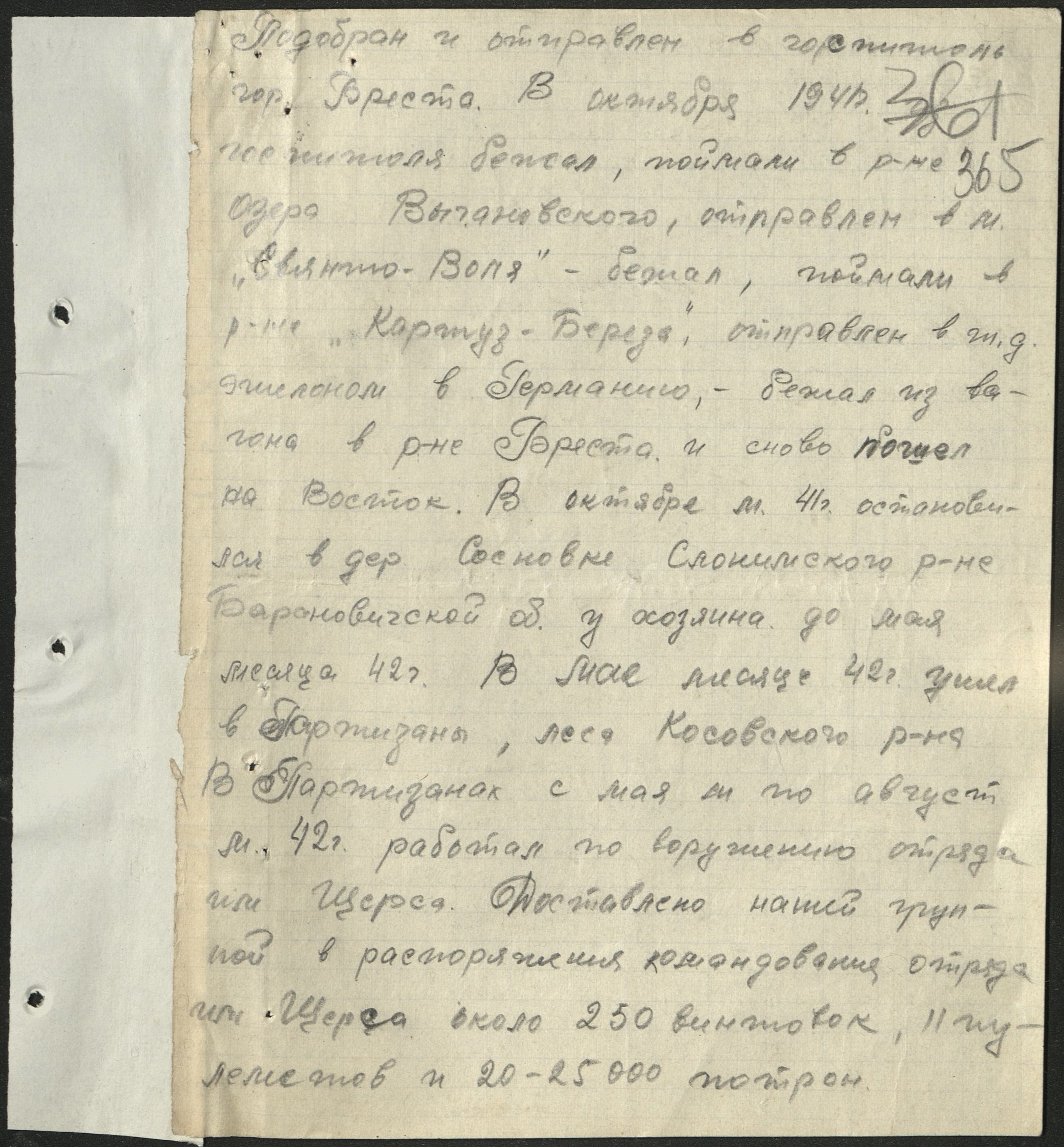 В сентябре 1941 г. из госпиталя бежал, поймали в р-не озера Выгановского, отправлен в м. «Свянто-Воля» - бежал, поймали в р-не «Картуз-Береза», отправлен ж.д. эшелоном в Германию, - бежал из вагона в р-не Бреста и снова пошел на Восток. В октябре м. 41 г. остановился в дер. Сосновке Слонимского р-на Барановичской обл. у хозяина до мая месяца 42 г. В мае месяце 42 г. ушел в Партизаны, леса Косовского р-на. В Партизанах с мая м. по август м. 42 г. работал по вооружению отряда им. Щорса. Доставлено нашей группой в распоряжение командования отряда им. Щорса около 250 винтовок, 11 пулеметов и 20-25 000 патрон.