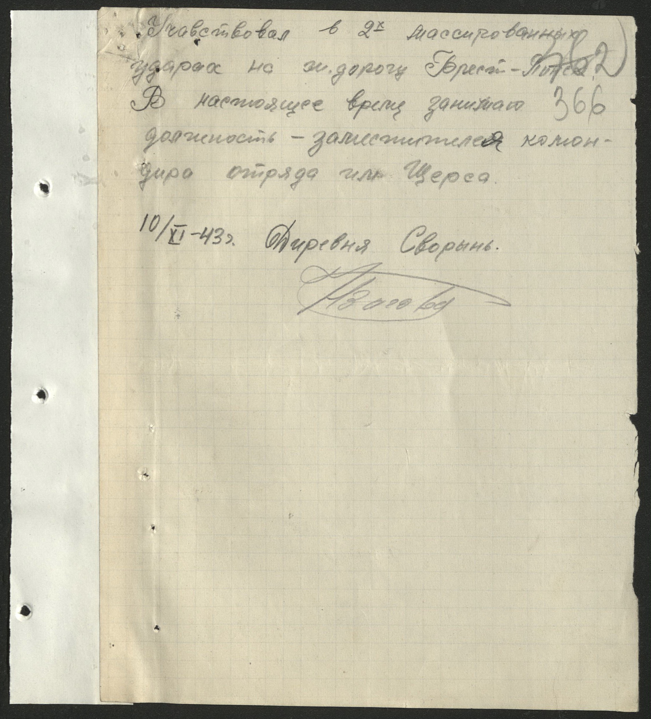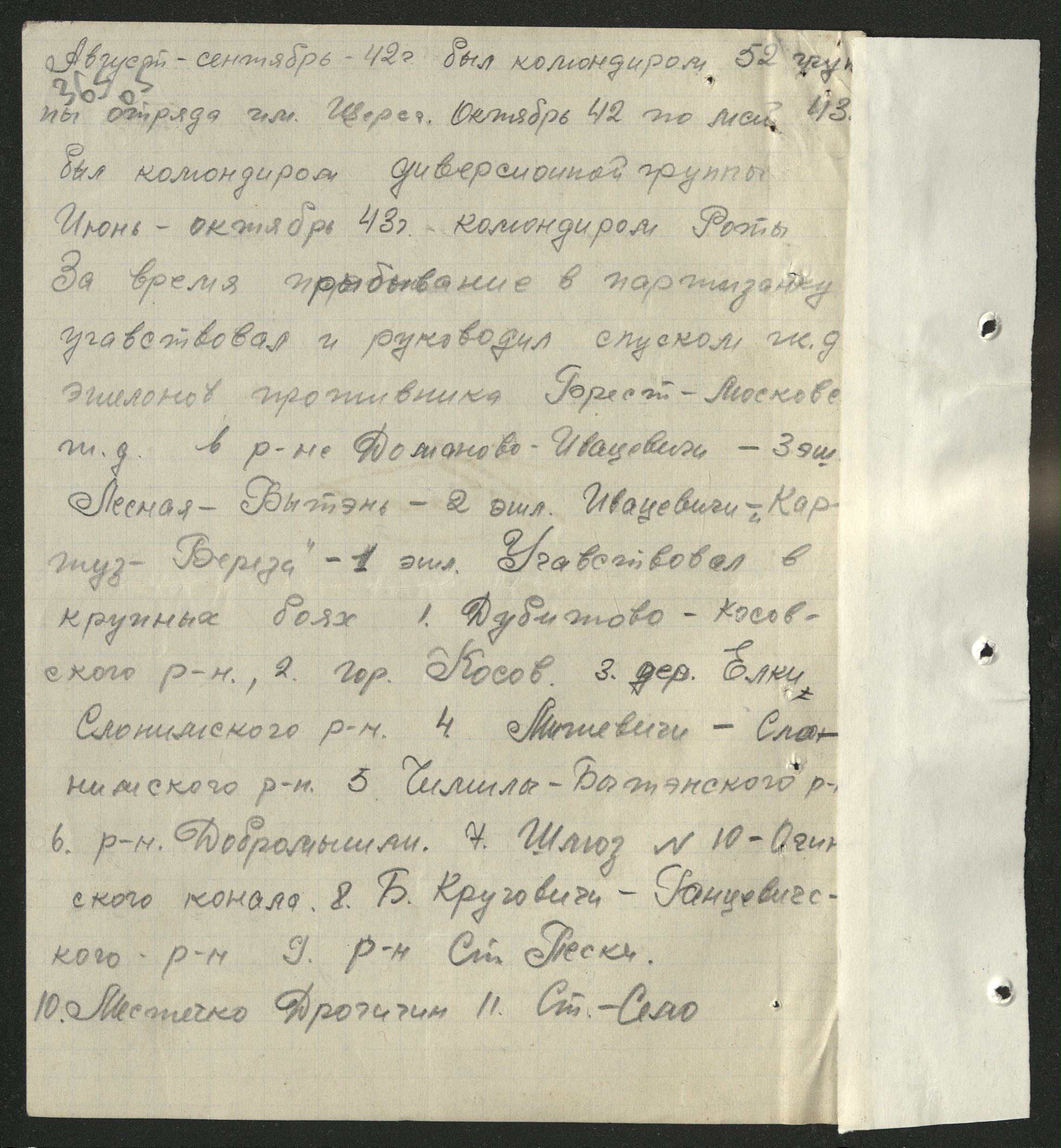 За время пребывания в партизанах участвовал и руководил спуском ж.д. эшелонов противника Брест-Московской ж.д. в р-не Доманово-Ивацевичи – 3 эш., Лесная – Бытень – 2 эш., Ивацевичи – Картуз-Береза – 1 эш. Участвовал в крупных боях 1. Дубитово -Косовского р-на, 2. гор.Косов, 3. дер. Елки Слонимского р-на, 4. Мижевичи Слонимского р-на, 5. Чимилы-Бытенского р-на, 6.р-н Добромышли, 7. Шлюз №10 Огинского канала, 8. Б.-Круговочи Ганцевичского р-на, 9. Р-н С. Пески, 10. Местечко Дрогичин, 11. Ст. Село.