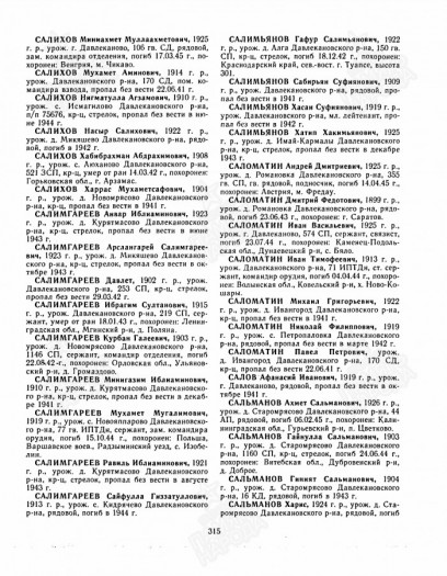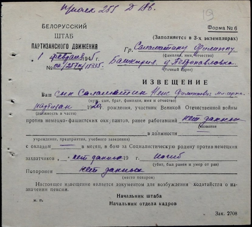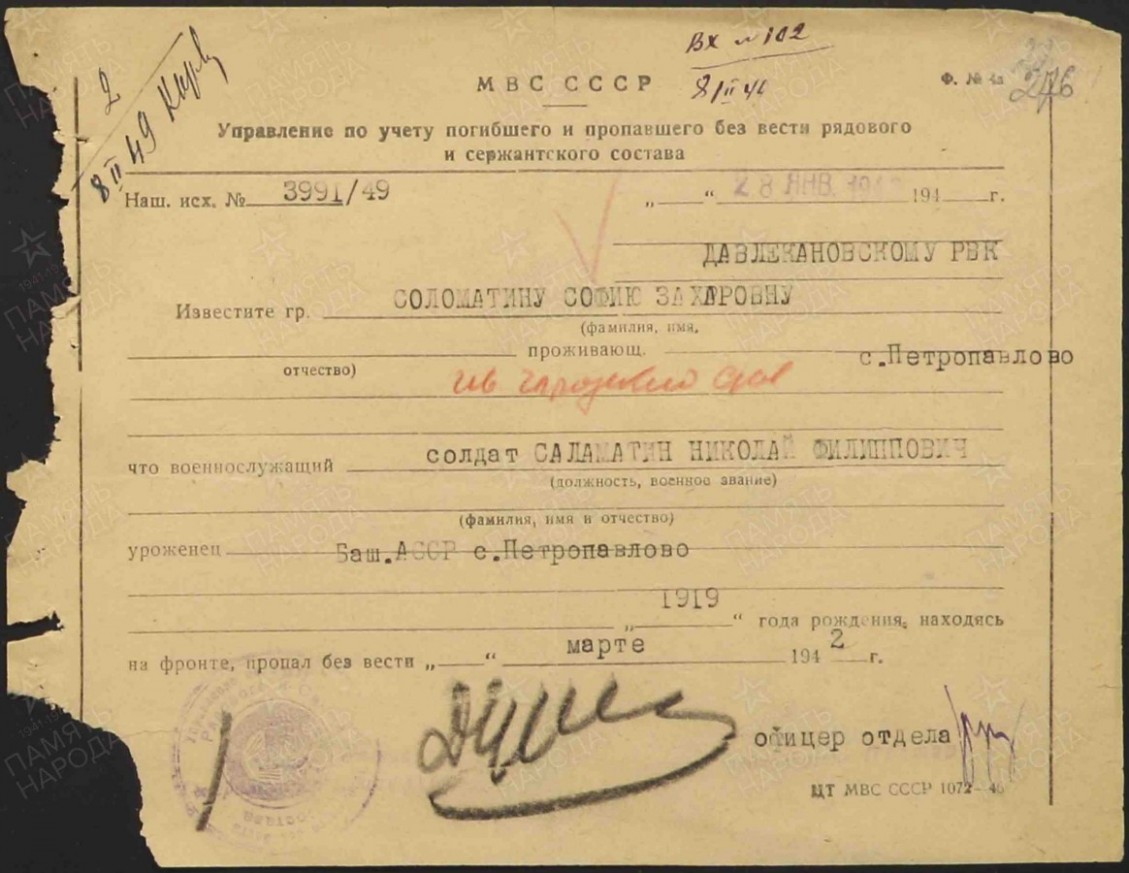 Причина выбытия: погиб, пропал без вести, где и когда не известно. Похоронка была направлена отцу Саламатину Филлипу в д. Петропавловка Башкирской АССР 01.02.1945 года.