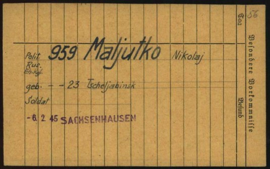 11 апреля 1945 года произошло освобождение узников концлагеря Бухенвальд. Заключенные взяли в руки оружие, напали на охрану и чуть более чем за час захватили территорию. После окончания восстания в Бухенвальд пришли американские войска. Бежавших эсэсовцев отлавливали по близлежащим лесам. Тысячи военнопленных были спасены. Однако сотни истощённых узников умерли после освобождения лагеря. Среди них и наш земляк - Саламатин Николай Филиппович (Николай Малютко) умер в лагере военнопленных «Ваймар-Бухенвальд» 21 апреля 1945 года. В «Книге мертвых» Бухенвальда значится: Nikolaj Maljutko. Todesdatum (дата смерти): 21.04.1945. Sterbeort (место смерти): Buchenwald.