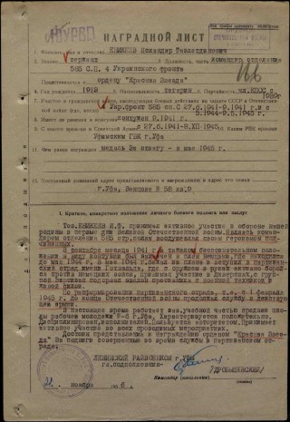 Достоин представления к награждению орденом «Красная Звезда» за подвиги, совершенные во время службы в партизанском отряде.».