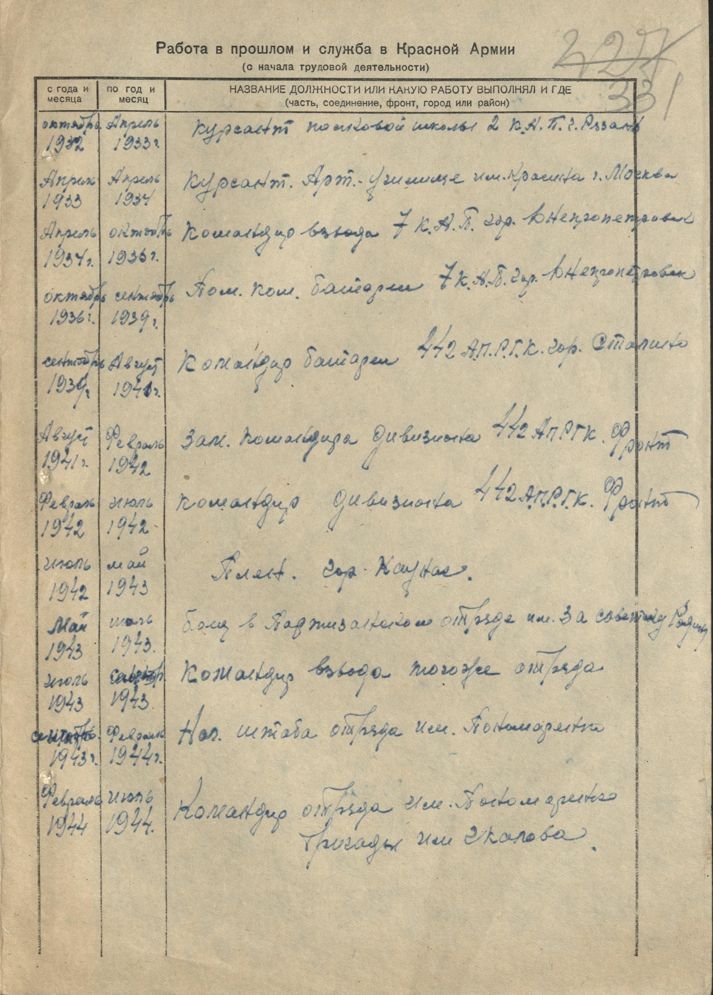 С 15 по 26 мая 1943 г. был рядовым бойцом в партизанском отряде «За Советскую Родину». С 26 мая по 15 июня 1943 г. – командир отделения там же, а с 15 июня по 11 сентября 1943 г. был в этом же отряде командиром взвода.